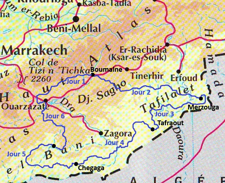 Le raid de dingue DESERT TOUR constitue le véritable tour du sud marocain composé d’étapes de 200 km à 300 km / jour, alliant la découverte des richesses géologiques du Maroc et l’effort physique. Très typé désert, sable et pistes roulantes, il enchantera les amoureux du hors-piste avec la traversée des ergs de Merzouga et Chegaga, mais aussi de nombreux tronçons de navigation et quelques très belles pistes de montagne.